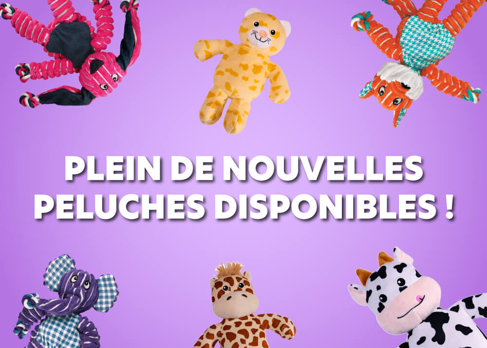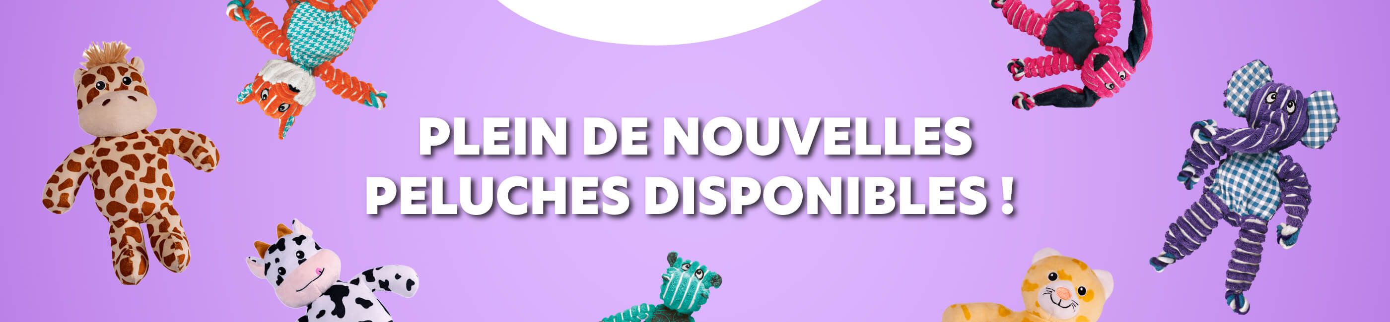Découvrez plein de nouvelles peluches avec corde, sifflet, visibles la nuit ou encore écoresponsables, il y en a pour tous les goûts et pour tous les chiens.
