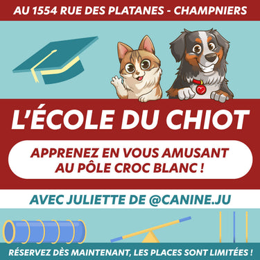 Profitez de l’École du Chiot, un moment ludique et éducatif proposé par Juliette de canine.ju, éducatrice diplômée, tous les mercredis de 11h à 12h, dans la salle d’activité du Pôle Croc Blanc.