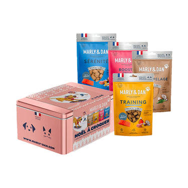 Découvrez la Boîte friandises "Noël à Croquer" de Marly & Dan, offrant à votre chien la chance de savourer 4 variétés de friandises de la marque :