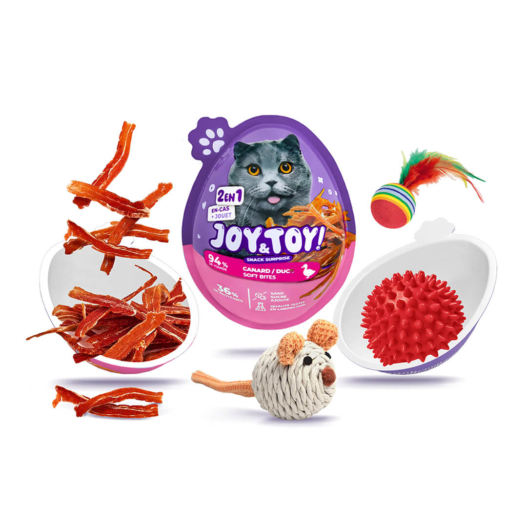 Joy & Toy propose des friandises naturelles associées à des jouets surprises pour offrir une expérience ludique et gourmande, parfaitement adaptée aux besoins comportementaux des chats.