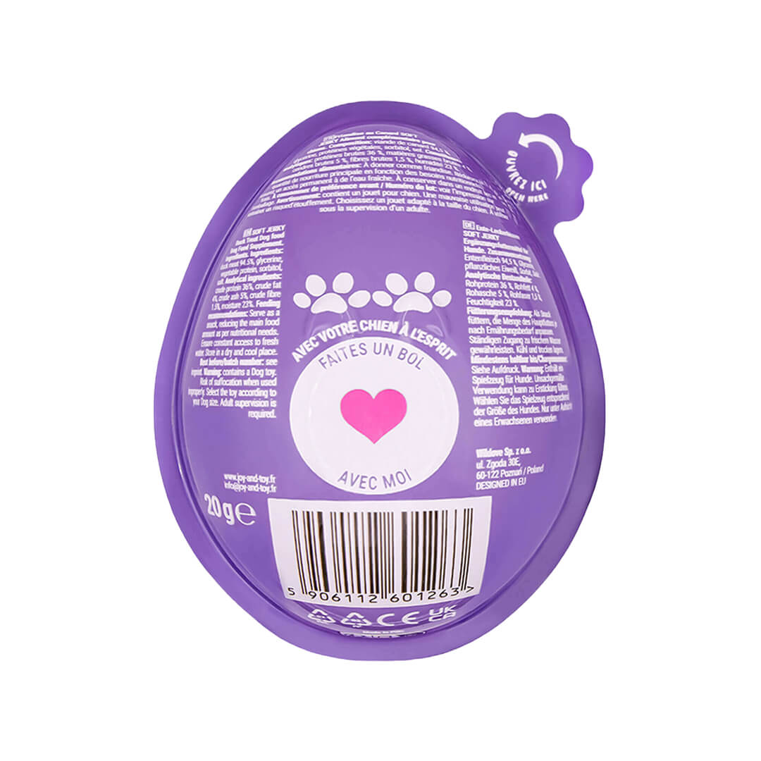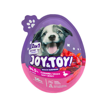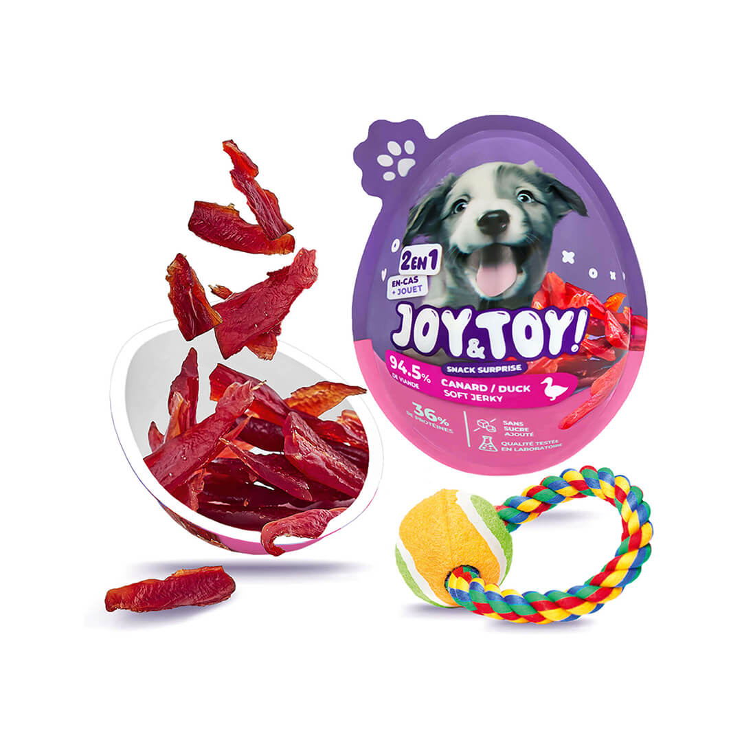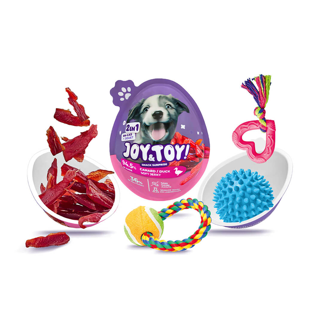 Le Joy & Toy Snack Surprise Canard est un concept 2 en 1 innovant qui combine une friandise gourmande et un jouet surprise. À l’intérieur de la capsule, votre chien découvre des lamelles tendres au canard ainsi qu’un jouet amusant sélectionné au hasard, idéal pour prolonger le plaisir après la dégustation.