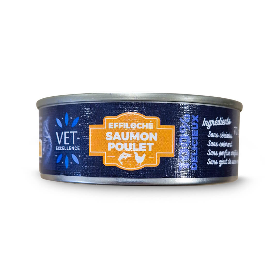 Pâtée pour chat Vet Excellence effiloché saumon poulet
